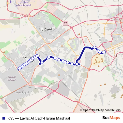 The first stop of the Ic95 bus route is Laylat Al Qadr and the last stop is Haram Mashaal. Ic95 (Laylat Al Qadr-Haram Mashaal) is operational during يومياً.