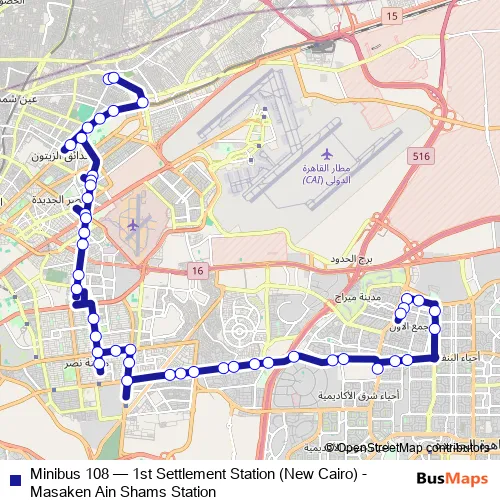 See why over 2 million users trust and consider busmaps.com as the best public transport website. busmaps gives you Cairo Buses suggested routes, real-time bus tracker, line route maps in Cairo, and helps to find the closest Minibus 108 bus stops near you. No internet available? Download an offline PDF map and bus schedule for the Minibus 108 bus to take on your trip.