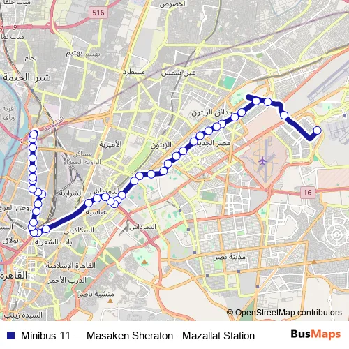 The first stop of the Minibus 11 bus route is Masaken Sheraton and the last stop is Al Mazallat Metro Station. Minibus 11 (Masaken Sheraton - Mazallat Station) is operational during يومياً.