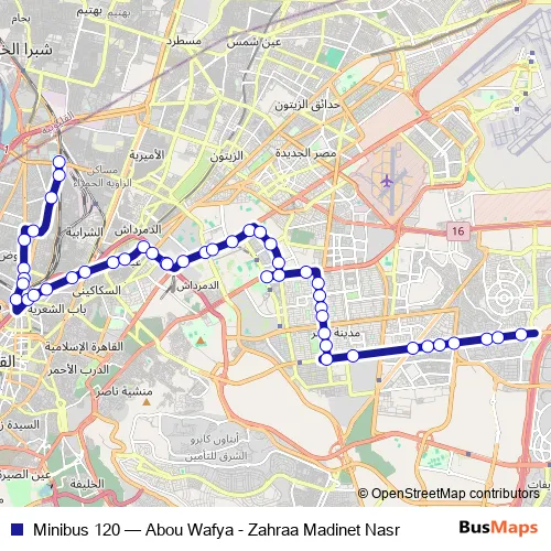 The first stop of the Minibus 120 bus route is Abou Wafya and the last stop is Zahraa Nasr City. Minibus 120 (Abou Wafya - Zahraa Madinet Nasr) is operational during يومياً.