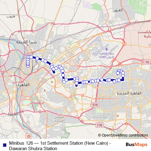 Click here to view the nearest Minibus 126 - 1st Settlement Station (New Cairo) - Dawaran Shubra Station bus stop.