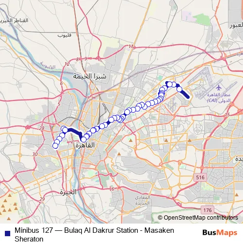 The first stop of the Minibus 127 bus route is Military Academy Stadium (Sheraton) and the last stop is East Bulaq Dakrur (Nahya). Minibus 127 (Bulaq Al Dakrur Station - Masaken Sheraton) is operational during يومياً.