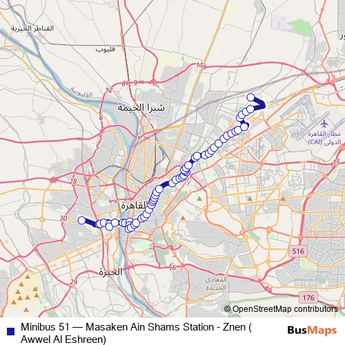 The first stop of the Minibus 51 bus route is Awwel Al Eshreen (Zenin) and the last stop is Masaken Ain Shams. Minibus 51 (Masaken Ain Shams Station - Znen (Awwel Al Eshreen)) is operational during يومياً.