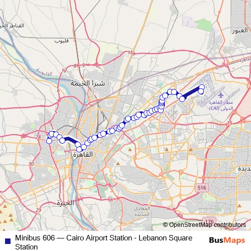 The first stop of the Minibus 606 bus route is Lebanon Square and the last stop is Cairo Airport. Minibus 606 (Cairo Airport Station - Lebanon Square Station) is operational during يومياً.