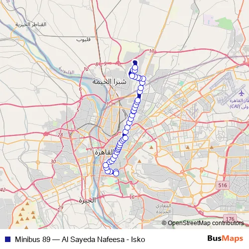 The first stop of the Minibus 89 bus route is Al Sayeda Nafeesa and the last stop is Bahteem Specialized Hospital For Surgery. Minibus 89 (Al Sayeda Nafeesa - Isko) is operational during يومياً.