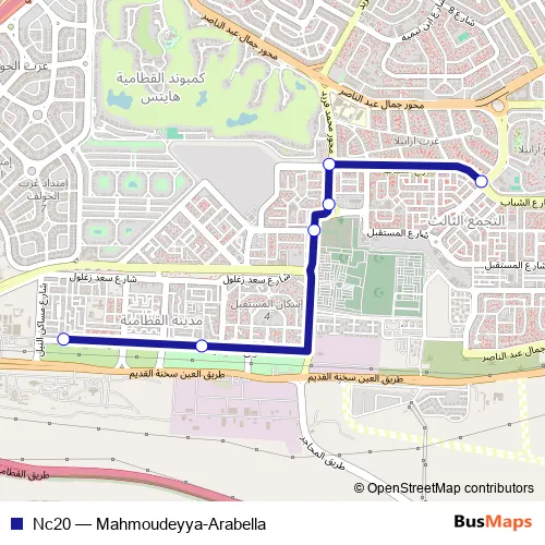 The first stop of the Nc20 bus route is Arabella Square and the last stop is Mahmoudeya - Kattameya. Nc20 (Mahmoudeyya-Arabella) is operational during يومياً.