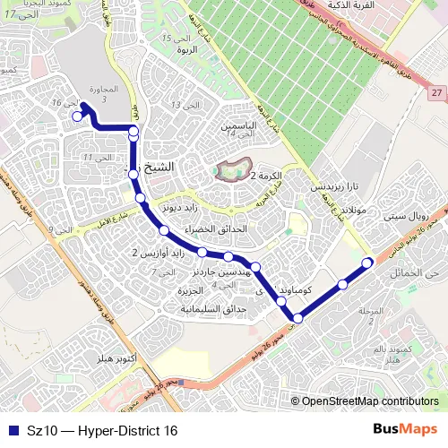 The first stop of the Sz10 bus route is Hyper One - Sheikh Zayed and the last stop is 16th District - Sheikh Zayed. Sz10 (Hyper-District 16) is operational during يومياً.