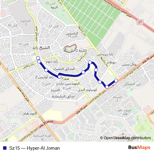 The first stop of the Sz15 bus route is Maahad Baneen - Sheikh Zayed and the last stop is Hyper One - Sheikh Zayed. Sz15 (Hyper-Al Joman) is operational during يومياً.
