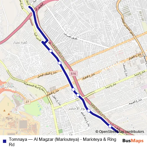 The first stop of the Tomnaya bus route is Gamal Al Din Al Banna St. & Al Checheeny St. and the last stop is Al Magzar (Al Mariouteya). Tomnaya (Al Magzar (Mariouteya) - Marioteya & Ring Rd) is operational during يومياً.