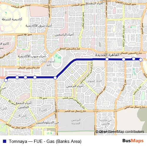The first stop of the Tomnaya bus route is Gas (5th Settlement) and the last stop is Future University in Egypt (Fue). Tomnaya (FUE - Gas (Banks Area)) is operational during يومياً.