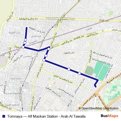 The first stop of the Tomnaya bus route is Mobil (Ahmed Esmat St.) and the last stop is Al Shaarawy (Arbean St.). Tomnaya (Alf Maskan Station - Arab Al Tawaila) is operational during يومياً.
