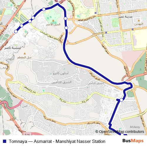 The first stop of the Tomnaya bus route is Manshiyat Nasser and the last stop is New Market (Asmarat). Tomnaya (Asmarrat - Manshiyat Nasser Station) is operational during يومياً.