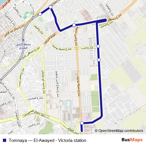 The first stop of the Tomnaya bus route is El Awayed Bridge End and the last stop is Victoria Station. Tomnaya (El-Awayed - Victoria station) is operational during يومياً.