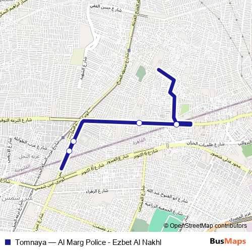 The first stop of the Tomnaya bus route is Al Qudsi Mosque (Ain Shams St.) and the last stop is El Warsha (Ezbet Al Nakhl). Tomnaya (Al Marg Police - Ezbet Al Nakhl) is operational during يومياً.