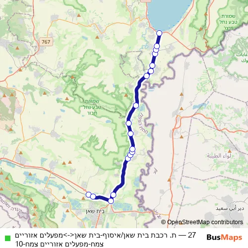 The first stop of the 27 bus route is قطار بيت شآن/تجميع and the last stop is تسيمح- مصانع غور الاردن. 27 (ת. רכבת בית שאן/איסוף-בית שאן<->מפעלים אזוריים צמח-מפעלים אזוריים צמח-10) is operational during يومياً.
