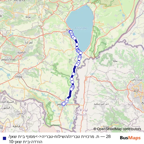 The first stop of the 28 bus route is م.مركزية طبريا/هشيلواح and the last stop is מסוף בית שאן/הורדה. 28 (ת. מרכזית טבריה/השילוח-טבריה<->מסוף בית שאן/הורדה-בית שאן-10) is operational during يومياً.