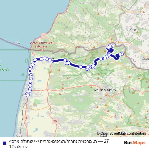The first stop of the 27 bus route is شتولا مركز and the last stop is محطة مركزية نَهَرِيا/تنزيل. 27 (ת. מרכזית נהריה/רציפים-נהריה<->שתולה מרכז-שתולה-1#) is operational during يومياً.