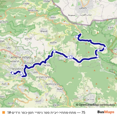 The first stop of the 75 bus route is متات and the last stop is مدرسة نيسويي تيفن. 75 (מתת-מתת<->בית ספר ניסויי תפן-כפר ורדים-1#) is operational during يومياً.
