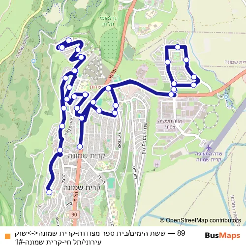 The first stop of the 89 bus route is شيشات هَيميم/مدرسة متسودوت and the last stop is سوق بلدي/تيل حاي. 89 (ששת הימים/בית ספר מצודות-קרית שמונה<->שוק עירוני/תל חי-קרית שמונה-1#) is operational during يومياً.