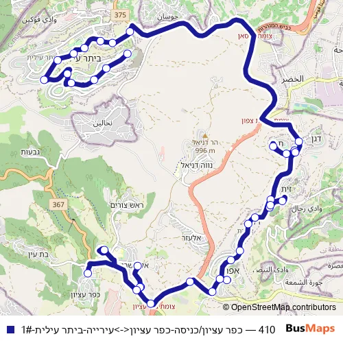 The first stop of the 410 bus route is البلدية and the last stop is كفر عتسيون/مدخل. 410 (כפר עציון/כניסה-כפר עציון<->עירייה-ביתר עילית-1#) is operational during يومياً.