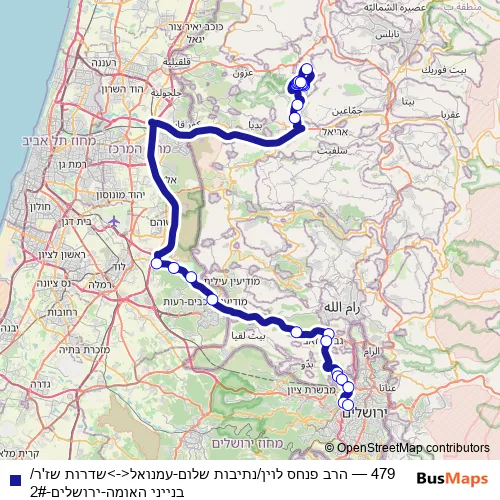 The first stop of the 479 bus route is هراف بيناحس ليفين/ نتيفوت شالوم and the last stop is שדרות שז'ר/בנייני האומה. 479 (הרב פנחס לוין/נתיבות שלום-עמנואל<->שדרות שז'ר/בנייני האומה-ירושלים-2#) is operational during عطلة نهاية الأسبوع.