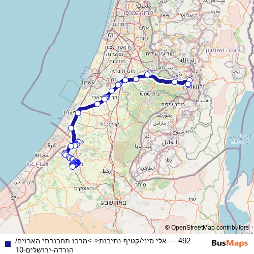 The first stop of the 492 bus route is مركز المواصلات هأرزيم/بين البلدان and the last stop is محطة قطار نتيفوت/أرصفة. 492 (אלי סיני/קטיף-נתיבות<->מרכז תחבורתי הארזים/הורדה-ירושלים-10) is operational during يومياً.