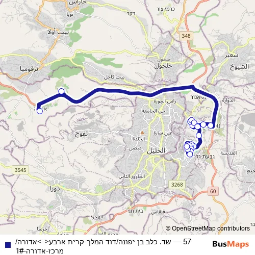 The first stop of the 57 bus route is أدورا/ مركز and the last stop is مركز تجاري/ يهوشع بن نون. 57 (שד. כלב בן יפונה/דוד המלך-קרית ארבע<->אדורה/מרכז-אדורה-1#) is operational during يومياً.