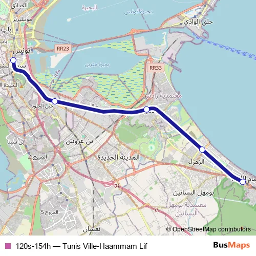 The first stop of the 120s-154h rail route is Tunis Ville and the last stop is Hammam Lif. 120s-154h (Tunis Ville-Haammam Lif) is operational during يومياً.