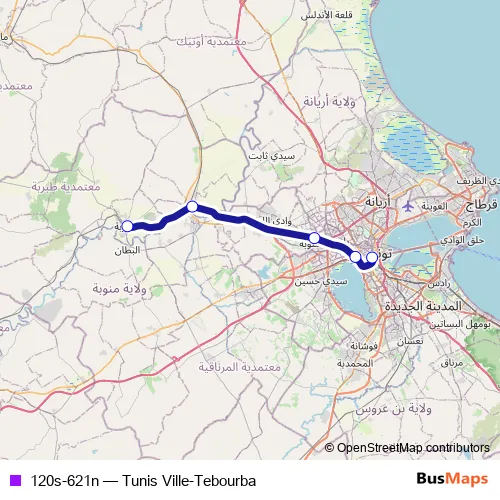 The first stop of the 120s-621n rail route is Tebourba and the last stop is Tunis Ville. 120s-621n (Tunis Ville-Tebourba) is operational during يومياً.