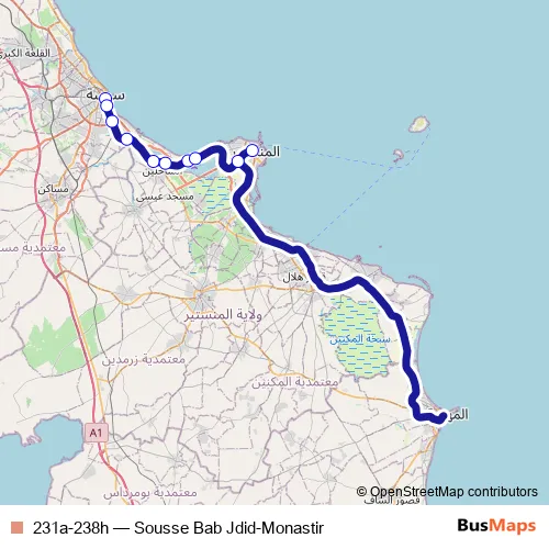 The first stop of the 231a-238h rail route is Sousse Bab Jdid and the last stop is Monastir. 231a-238h (Sousse Bab Jdid-Monastir) is operational during يومياً.