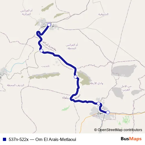 The first stop of the 537n-522x rail route is Om El Arais and the last stop is Metlaoui. 537n-522x (Om El Arais-Metlaoui) is operational during يومياً.