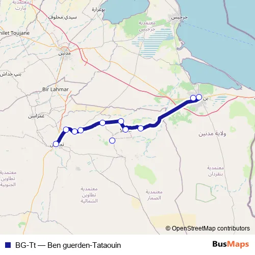 The first stop of the BG-Tt bus route is Tatouine and the last stop is Bengeurdenne. BG-Tt (Ben guerden-Tataouin) is operational during يومياً.