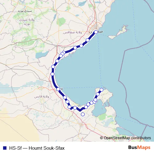 The first stop of the HS-Sf bus route is Sfax and the last stop is Houmet Souk. HS-Sf (Houmt Souk-Sfax) is operational during يومياً.