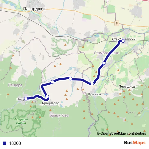The first stop of the 18208 rail route is Стамболийски and the last stop is Пещера. 18208 is operational during всеки ден.