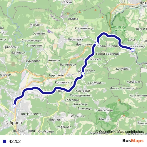 See why over 2 million users trust and consider busmaps.com as the best public transport website. busmaps gives you Gabrovo Rail Services suggested routes, real-time bus tracker, line route maps in Gabrovo, and helps to find the closest 42202 rail stops near you. No internet available? Download an offline PDF map and bus schedule for the 42202 rail to take on your trip.