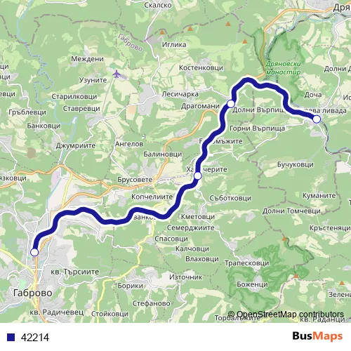 The first stop of the 42214 rail route is Царева ливада and the last stop is Габрово. 42214 is operational during всеки ден.