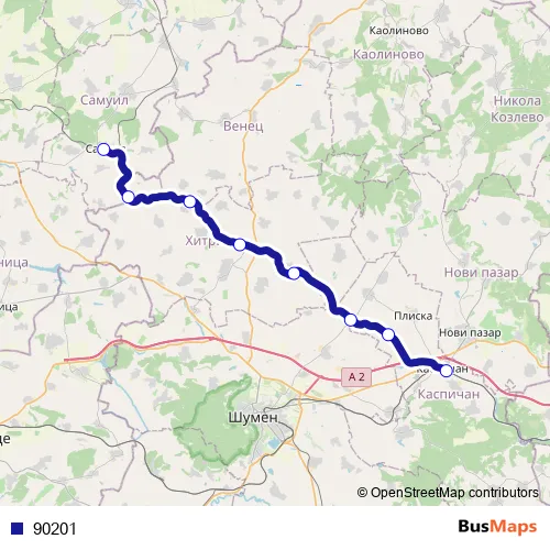 The first stop of the 90201 rail route is Самуил and the last stop is Каспичан. 90201 is operational during всеки ден.