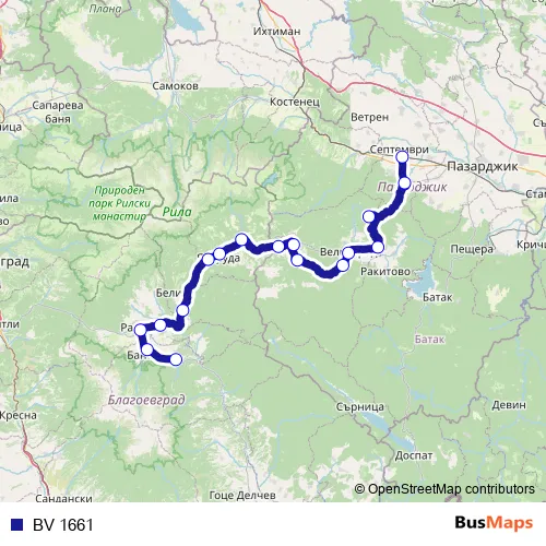 The first stop of the BV 1661 rail route is Септември and the last stop is Добринище. BV 1661 is operational during всеки ден.