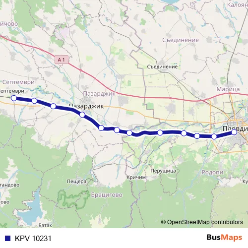 The first stop of the KPV 10231 rail route is Септември and the last stop is Централна гара Пловдив. KPV 10231 is operational during всеки ден.