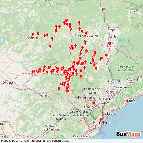 17 Bages Bus, Sau operates in the following cities: Sant Fruitos de Bages, Avia, Sant Salvador de Guardiola, Sant Joan de Vilatorrada, Callus, Manresa, Rajadell, Avinyo, Balsareny, Calaf, Capolat, Castelltercol, Gironella, Vic.