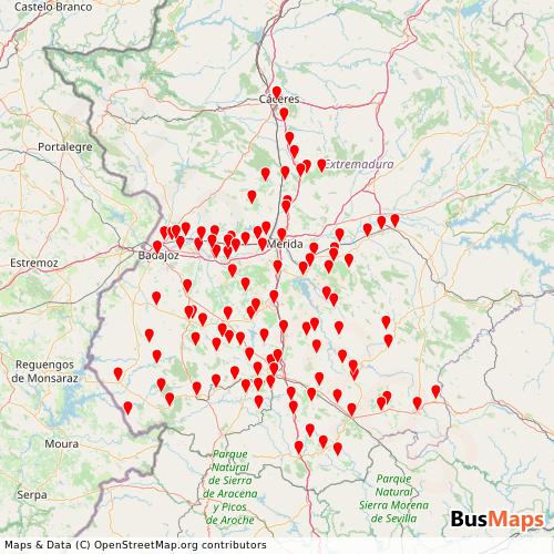 Autocares De Badajoz Sl operates in the following cities: Valdelacalzada, Merida, Salvatierra de los Barros, Torremayor, Alconera, Alcuescar, Aljucen, Badajoz, Fuente de Cantos, Lobon, Mengabril, Puebla del Maestre, Santa Marta, Solana de los Barros, Valencia de las Torres, Valencia del Mombuey, Valverde de Burguillos, Valverde de Leganes, Villalba de los Barros.