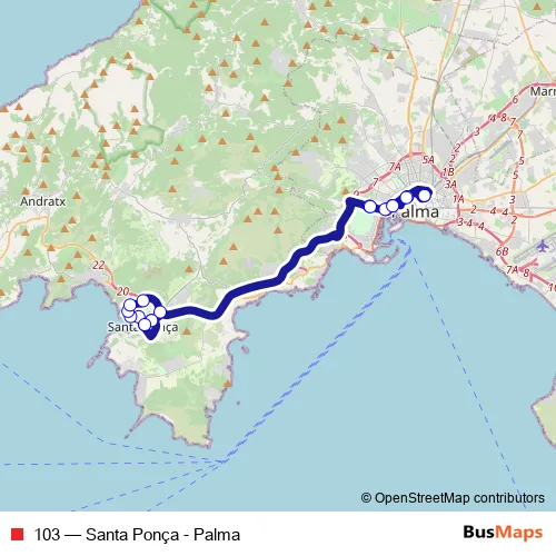 The first stop of the 103 bus route is Estació Intermodal (bus) and the last stop is Estació Intermodal (bus). 103 (Santa Ponça - Palma) is operational during cada dia.