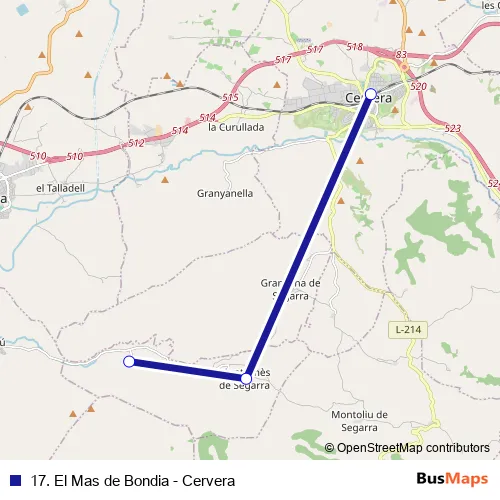 The first stop of the 17. El Mas de Bondia - Cervera bus route is El Mas de Bondia and the last stop is Cervera (estacio d autobusos). 17. El Mas de Bondia - Cervera (17. El Mas de Bondia - Cervera) is operational during dies feiners.