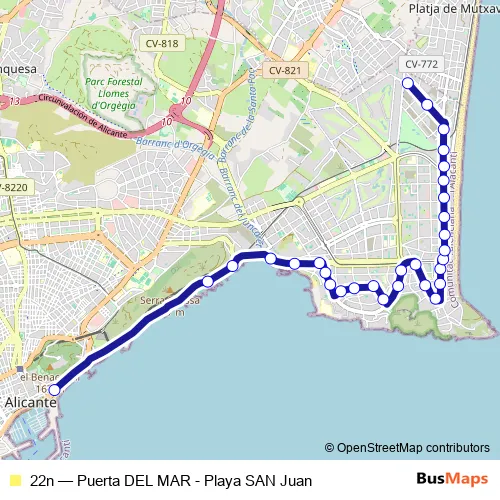 See why over 2 million users trust and consider busmaps.com as the best public transport website. busmaps gives you Alicante Buses suggested routes, real-time bus tracker, line route maps in Alicante, and helps to find the closest 22n bus stops near you. No internet available? Download an offline PDF map and bus schedule for the 22n bus to take on your trip.
