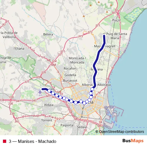 The first stop of the 3 metro route is Manises and the last stop is Machado. 3 (Manises - Machado) is operational during cada dia.