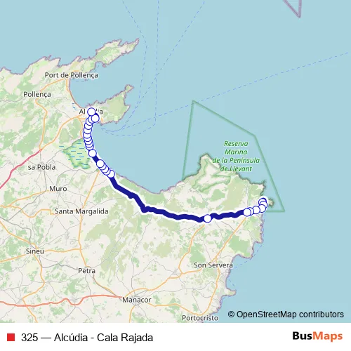 The first stop of the 325 bus route is Cala Agulla 2 (14014) and the last stop is Pol·lèntia (3033). 325 (Alcúdia - Cala Rajada) is operational during cada dia.