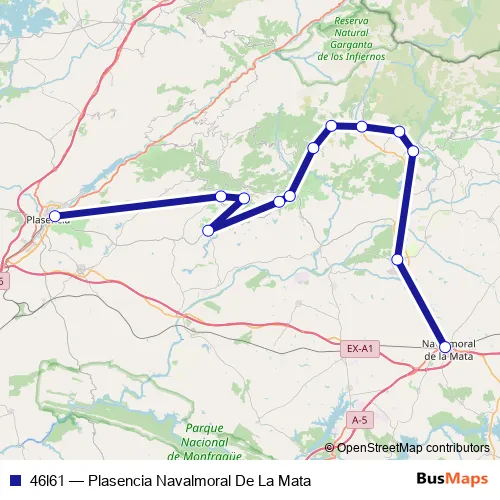 The first stop of the 46l61 bus route is Navalmoral De La Mata and the last stop is Plasencia. 46l61 (Plasencia Navalmoral De La Mata) is operational during dies feiners.