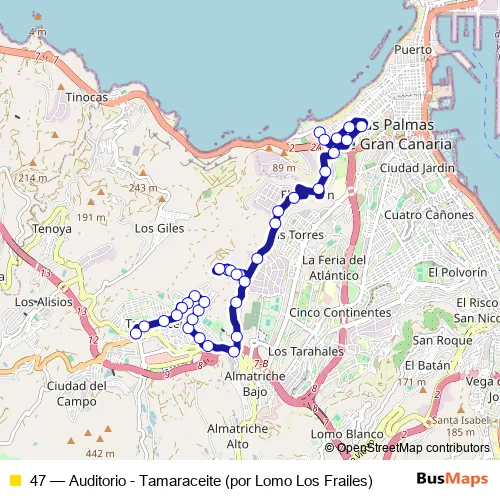 The first stop of the 47 bus route is Auditorio and the last stop is Intercambiador de Tamaraceite. 47 (Auditorio - Tamaraceite (por Lomo Los Frailes)) is operational during cada dia.