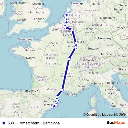 The first stop of the 530 bus route is Amsterdam, Duivendrecht and the last stop is Barcelona Sants. 530 (Amsterdam - Barcelona) is operational during cada dia.