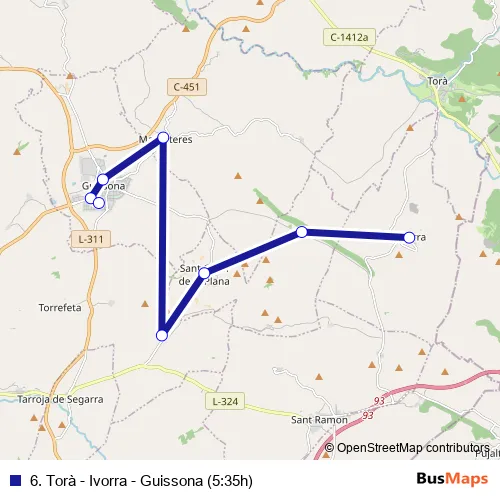 Cots Alsina 6. Torà - Ivorra - Guissona (5:35h) bus Route Map